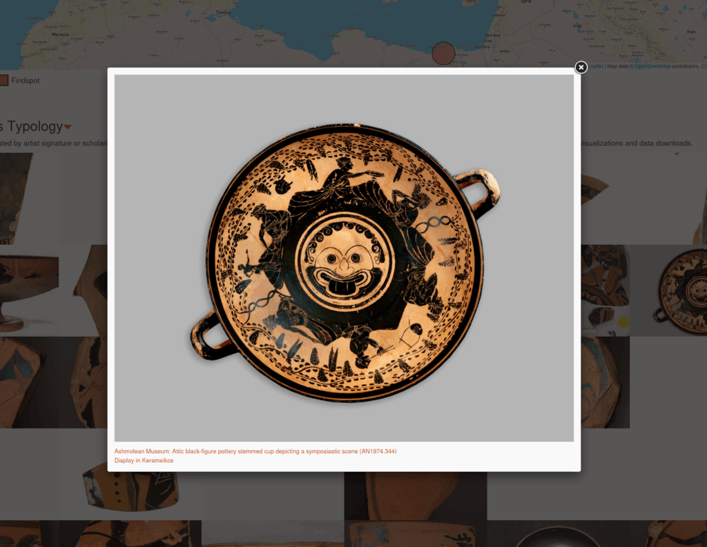 Today, more than 950 Attic vases from the Ashmolean Museum at the University of Oxford were integrated into the Greek pottery Linked Open Data cloud. The new Ashmolean collections database enables CSV export, which was reconciled in OpenRefine to Kerameikos URIs for shapes, techniques, artists, etc (using the reconciliation APIs that we built for Kerameikos). I should note that only the Attic vases were exported (almost entirely Archaic and Classical), not all objects from the ancient Greek world, so much remains to be integrated from the museum. Additionally, only Black-figure painters and potters have been rigorously defined. There is a smattering of Red-figure artists in Kerameikos from our 2014 prototype (Berlin Painter, Achilles Painter, and a few others), but we have not yet minted URIs for the whole range of Attic Red-figure artists. Therefore, some Ashmolean vases don’t link to artist URIs that have not yet been created.
